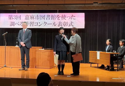 | 『第3回嘉麻市図書館を使った 2月7日に「第3回嘉麻市図書館を使った調べる学習コンクール」の表彰状授与式を開催しました。参加者を前に子どもたちは緊張の面持ちでしたが、堂々と賞状を受け取り、しっかりと作品についてインタビューに答えてくれました。受賞したみなさま、本当におめでとうございます! 応募総数1250作品中、受賞作品を含む19作品は、第29回図書館を使った調べる学習コンクール(主催:公益財団法人図書館振興財団)に推薦させていただきました。結果、赤石