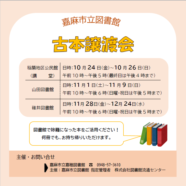 嘉麻市立図書館 2025秋の読書週間事業 「古本譲渡会」 雑誌から絵本、小説まで様々な本をご準備しています。 (嘉穂図書館の役目を終えた本は、稲築地区公民館の会場で譲渡します。) 持ち帰り自由・冊数制限なし この機会に本との出会いはいかがでしょうか? |