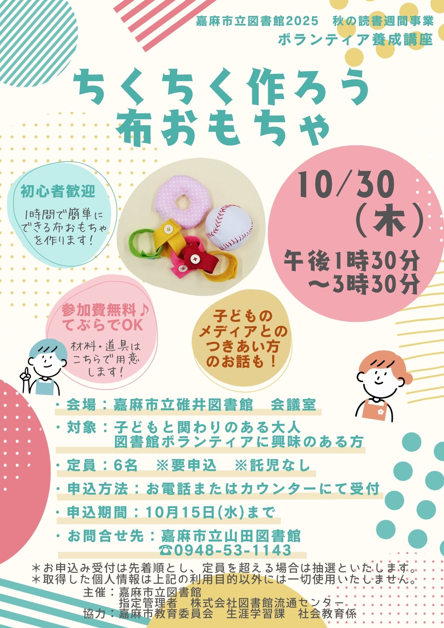 嘉麻市立図書館2025 秋の読書週間事業 日時:10月30日(木)午後1時30分~3時30分 会場:嘉麻市立碓井図書館 会議室 定員:6名 要申込み・託児なし 申込み多数の場合は抽選 申込方法:お電話または、図書館カウンターにて受付 申込期間:10月15日(水)まで 参加費:無料