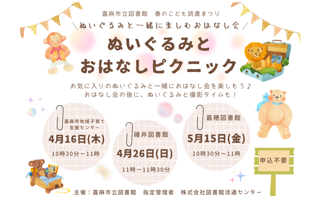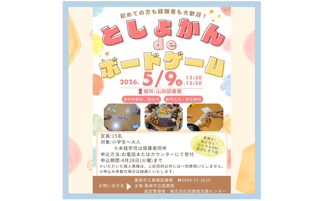 | ピックアップ情報更新しました 2026年4月1日 『春の子ども読書まつり~ことばが きみの はねになる~』開催のお知らせ 『ぬいぐるみとおはなしピクニック』開催のお知らせ 『としょかん de ボードゲーム』開催のお知らせ |
