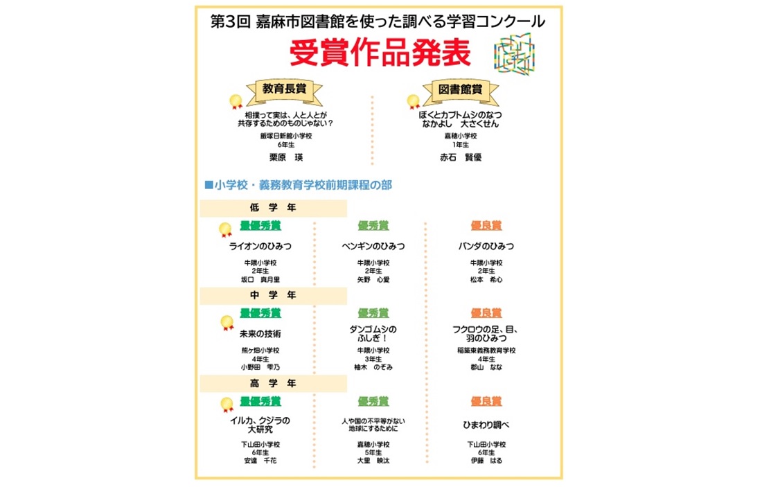 | ピックアップ情報更新しました! 2025年11月27日 『第3回嘉麻市図書館を使った調べる学習コンクール受賞作品発表』のお知らせ 2025年10月31日 『鉄道大好き!上山田線の歴史と幻の鉄道計画を探る』開催のお知らせ 2025年10月31日 『知ることからはじめよう、読書バリアフリー』開催のお知らせ |
