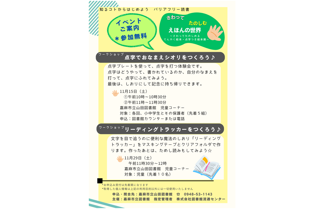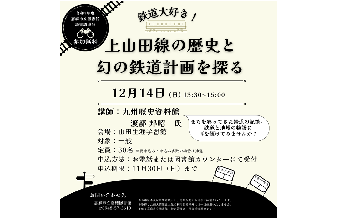 | ピックアップ情報更新しました! 2025年10月31日 『鉄道大好き!上山田線の歴史と幻の鉄道計画を探る』開催のお知らせ 2025年10月31日 『知ることからはじめよう、読書バリアフリー』開催のお知らせ 2025年10月1日 『古本譲渡会』開催のお知らせ |