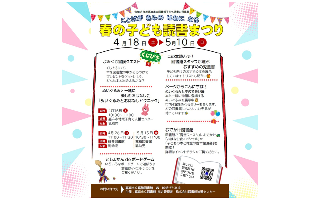 | ピックアップ情報更新しました 2026年4月1日 『春の子ども読書まつり~ことばが きみの はねになる~』開催のお知らせ 『ぬいぐるみとおはなしピクニック』開催のお知らせ 『としょかん de ボードゲーム』開催のお知らせ |